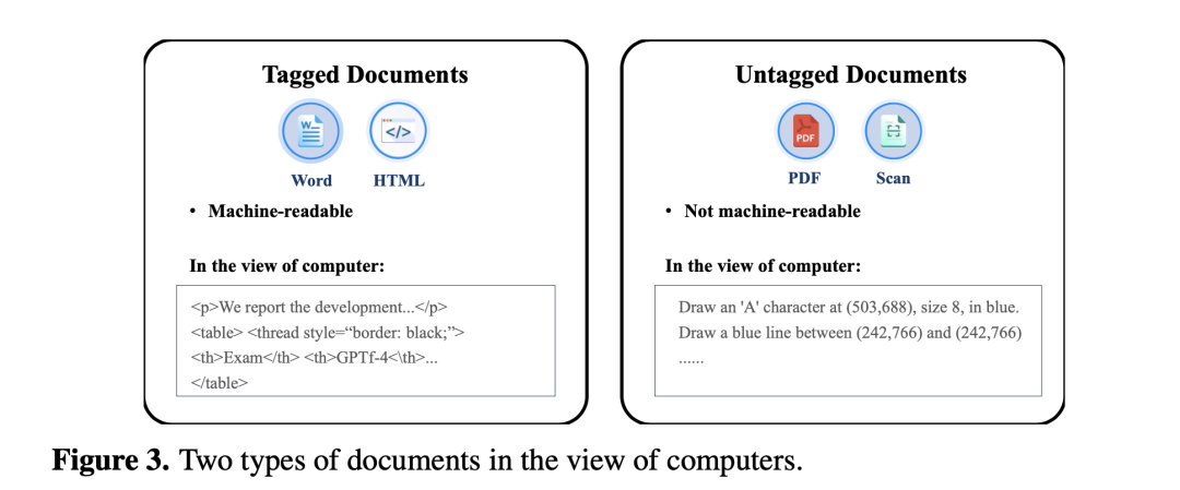 另一种是无标记文档,例如PDF文件,它存储了关于每个文档页面上字符、线条和其他内容元素位置的说明,其重点是"绘制"这些基本内容元素,使文档对人类读者具有可读性,不存储文档的任何结构信息,如表格或段落。因此,无标记文档只能供人类电子阅读,机器无法阅读。